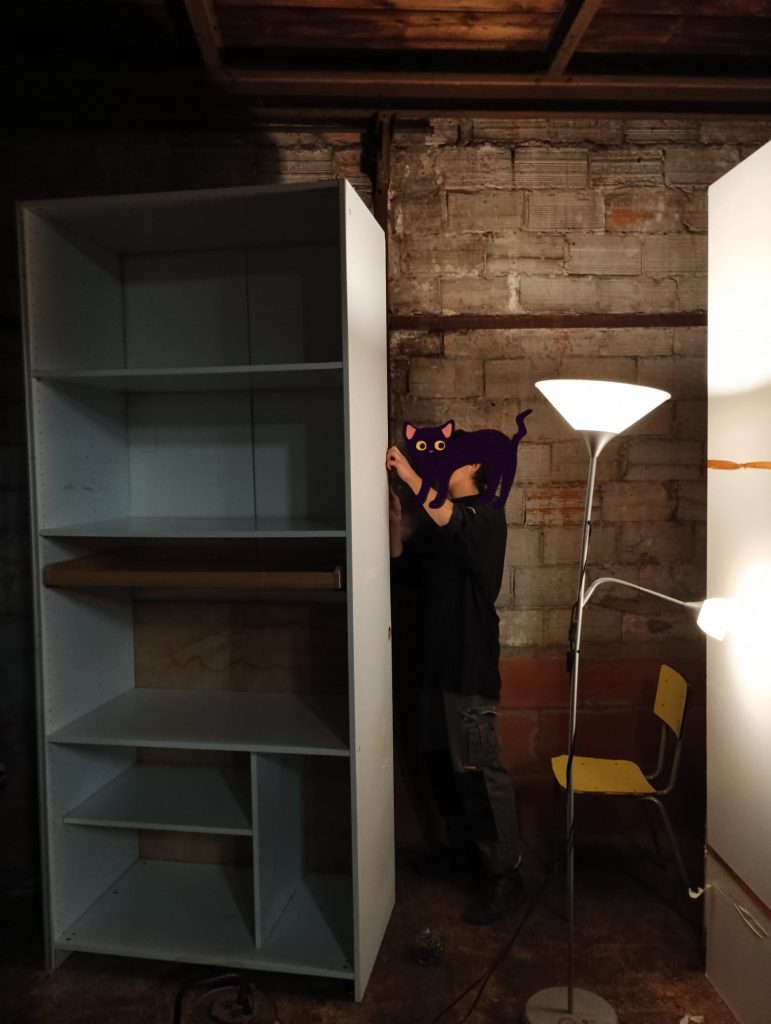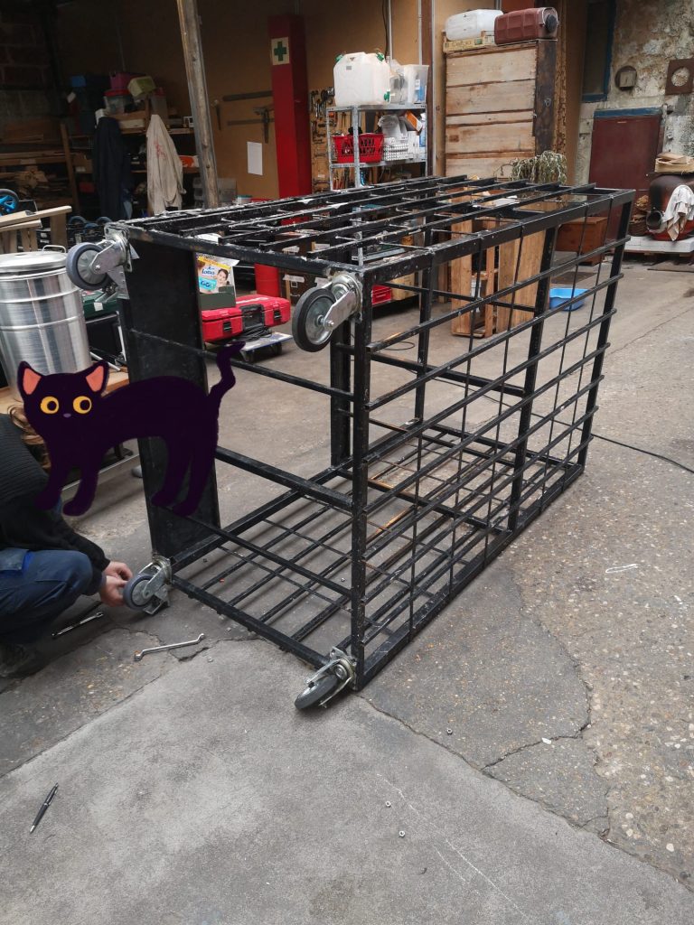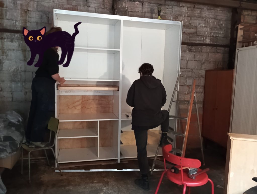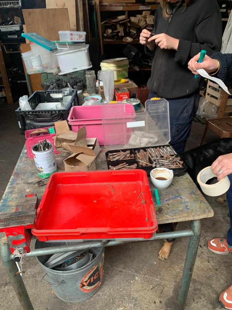 Suite de l’installation de l’espace tri/démantèlement avec le montage/réparation d’un grand dressing et d’un chariot. Installation de chariots de tri par matière et d’un espace de travail :