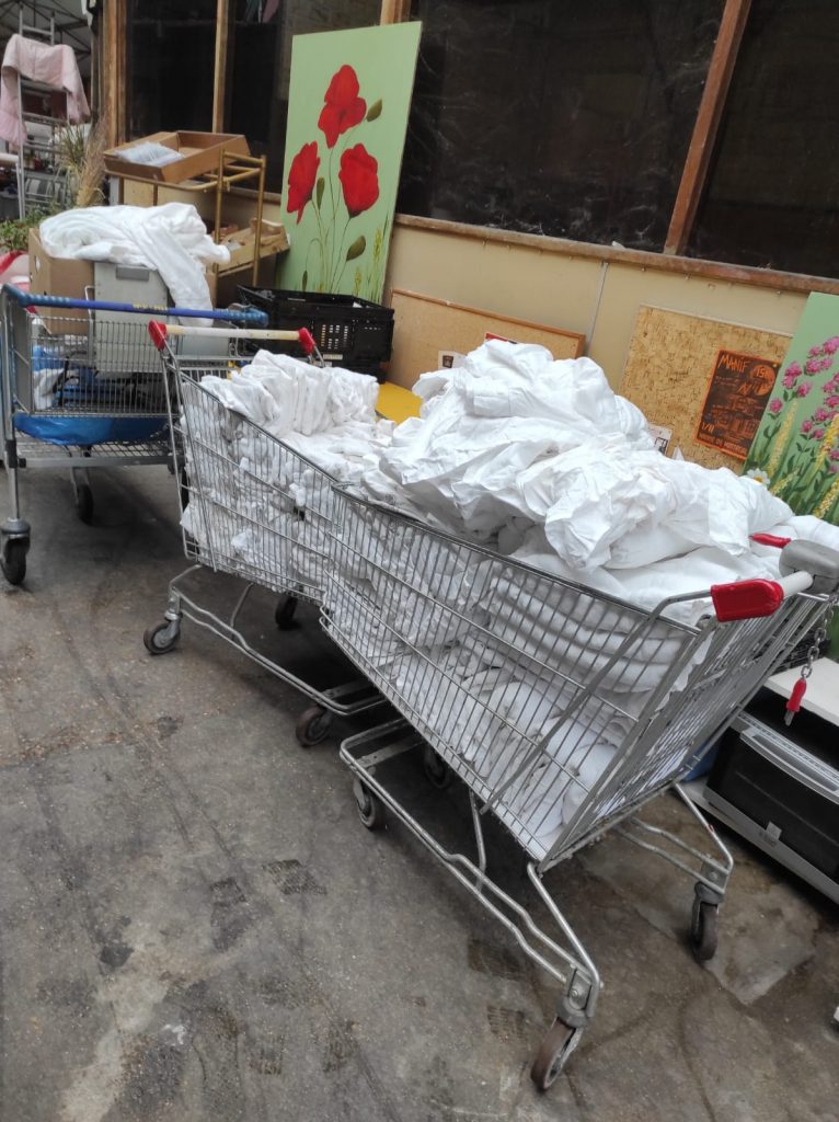 Nous distribuons des articles de seconde main issus des collectes du mercredi soir, de récupérations de magasins (BioCBon, Auchan, Framprix, la Louve, la ferme du LEO….) de marques partenaires (Lush, Oh my Cream…) des échanges avec d’autres associations solidaires ( Humanity diaspo, le Secours Populaire Pantin, la Petite Ruche, Les comptoirs de l’Est, Les Hôtels solidaires, La Contremarque, Rêvons la culture….) et d’achats pour les produits d’hygiène et les couches via les dons récoltés par les adhésions (voir sur Hello Asso).